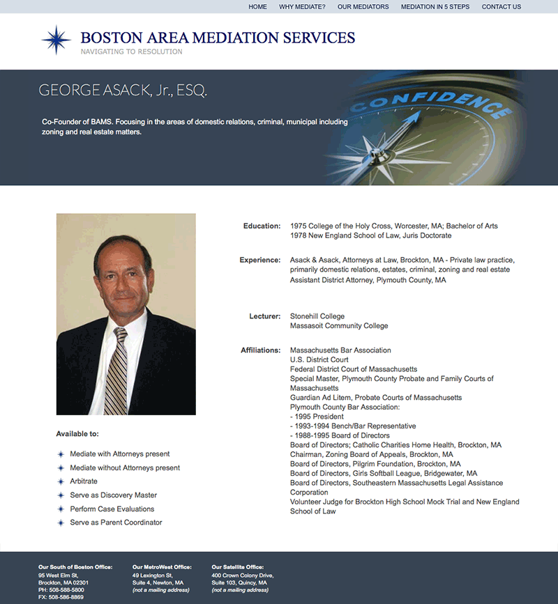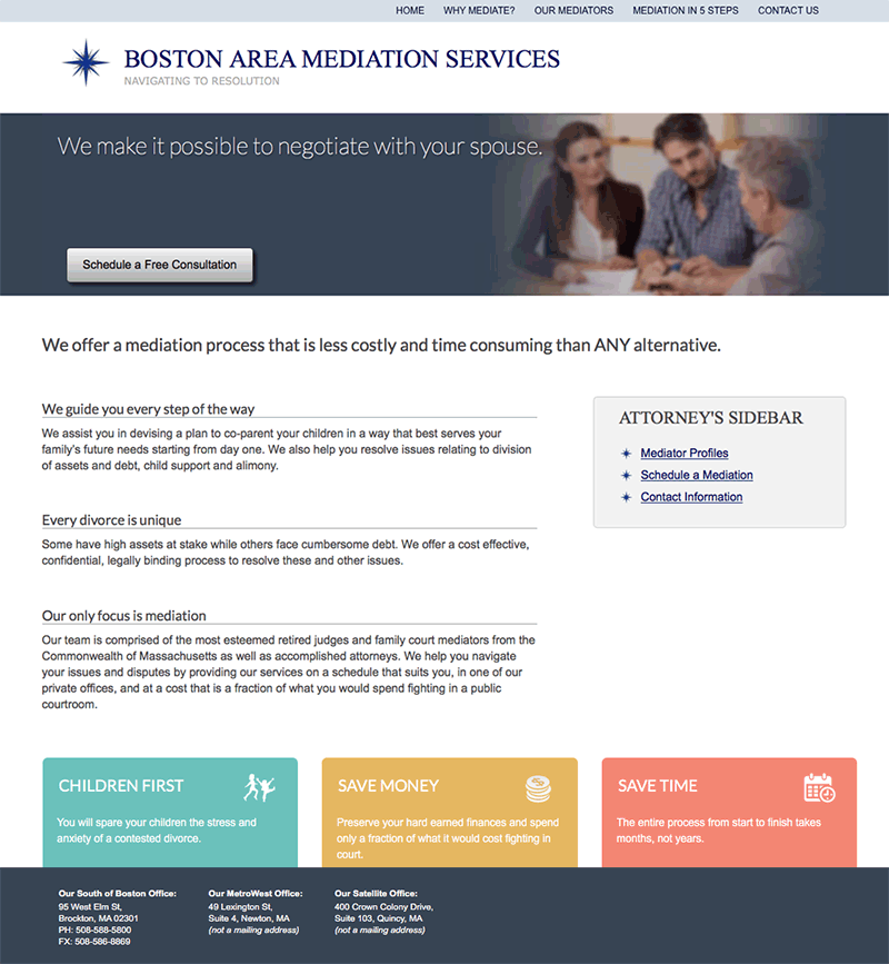I created the IA, Visual Design and coded this responsive website to represent the firm's professional yet compassionate persona. Mediation, by nature involves conflict but the clients wanted the website to make a viewer feel comfortable and welcome. The use of whitespace upholds their professionalism while the typefont and imagery welcomes them into the site. The website structure, on-point content, and SEO brought them first page ranking on Google Search.