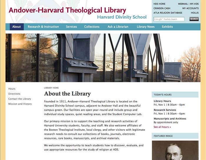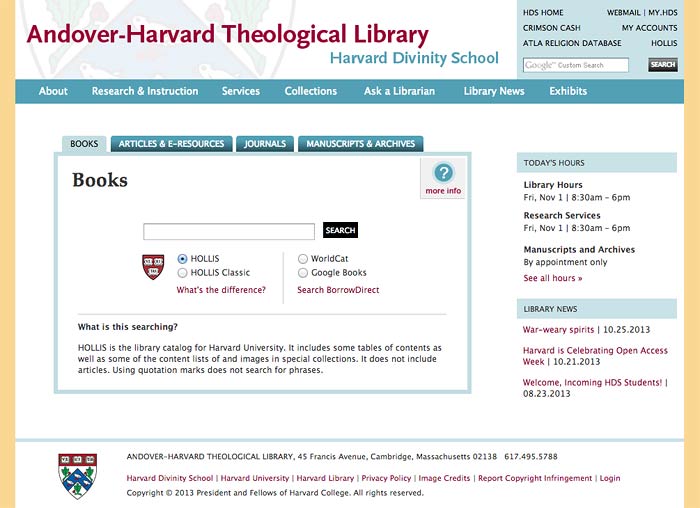 The Harvard Divinity School Library is a drupal CMS driven website utilizing a custom theme I created. The multi-faceted search interface I designed went through rigorous user testing and was so well liked by the school, it was incorporated in many of its sister library sites.