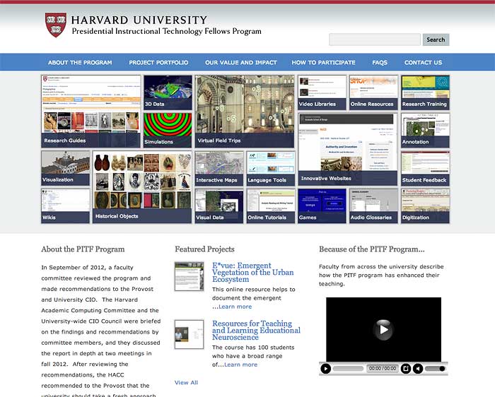 The Presidential Instructional Technology Fellows (PITF) site is a drupal CMS-based website utilizing a custom theme that I designed. It's design goal was to showcase the numerous digital projects of Harvard's IT Fellows. I also contributed to creating the information architecture and taxonomy of the site.