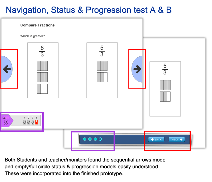 We needed to lock down the most intuitive navigation model for 3G users. Requirements for displaying an intuitive lesson status and progression for teachers were an added challenge. For this we turned to user testing. Limiting visual design to a minimum, I created interactive wireframes of two navigation & status models (outlined in red & purple). Presented to 8 users, the results identified certain elements we incorporated going forward.