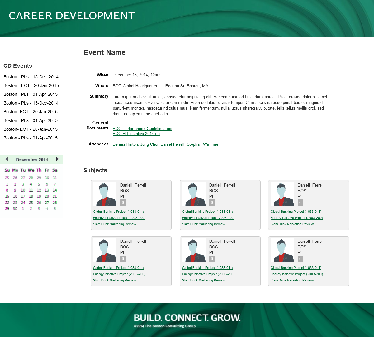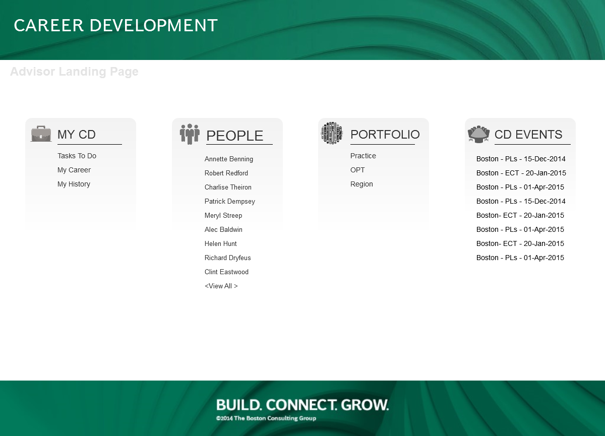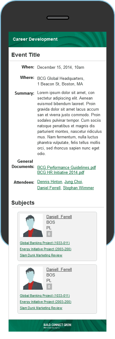 In contract with the Boston Consulting Group, I developed a visual design for their internal individual Career Development Review application. Based on employee role, they are served contextual content for their (or their staff's) career review process. My goal was to provide a clean IA with quick visualization of content (many will use this on a mobile platform) while observing BCG's style guide that I had also created. These wireframes were used in a business case proposal for future development.