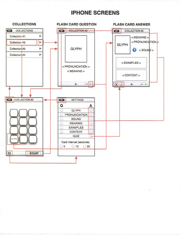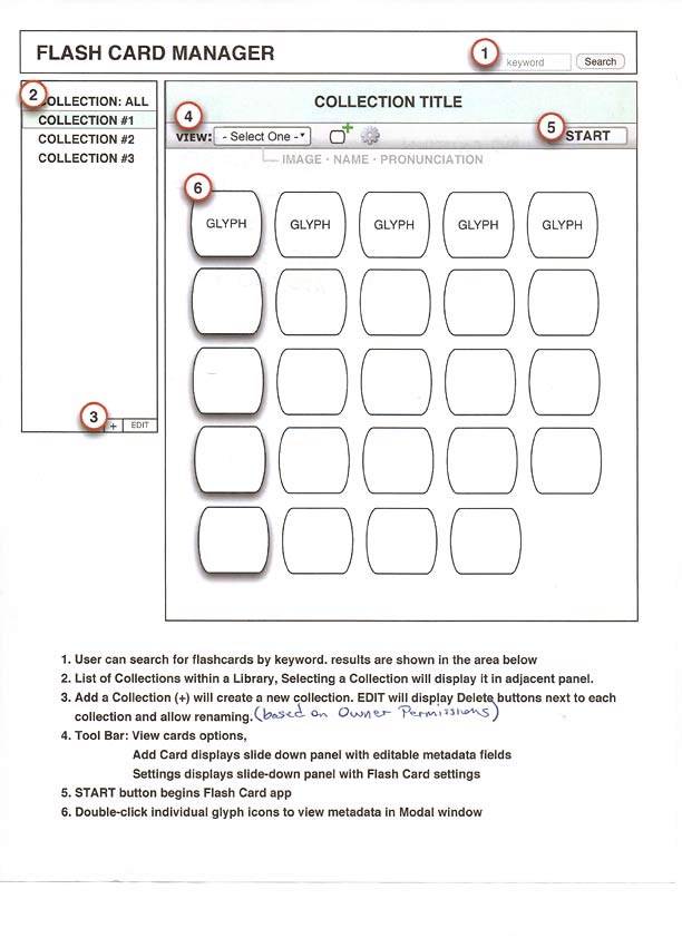 I was tasked with creating the interaction and visual design for a Flashcard application. Here are some preliminary wireframes with notes. The first wireframe depicts the layout for a desktop screen. The second wireframe depicts layout, structure, and process flow for mobile platforms.