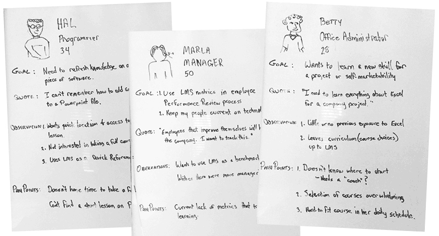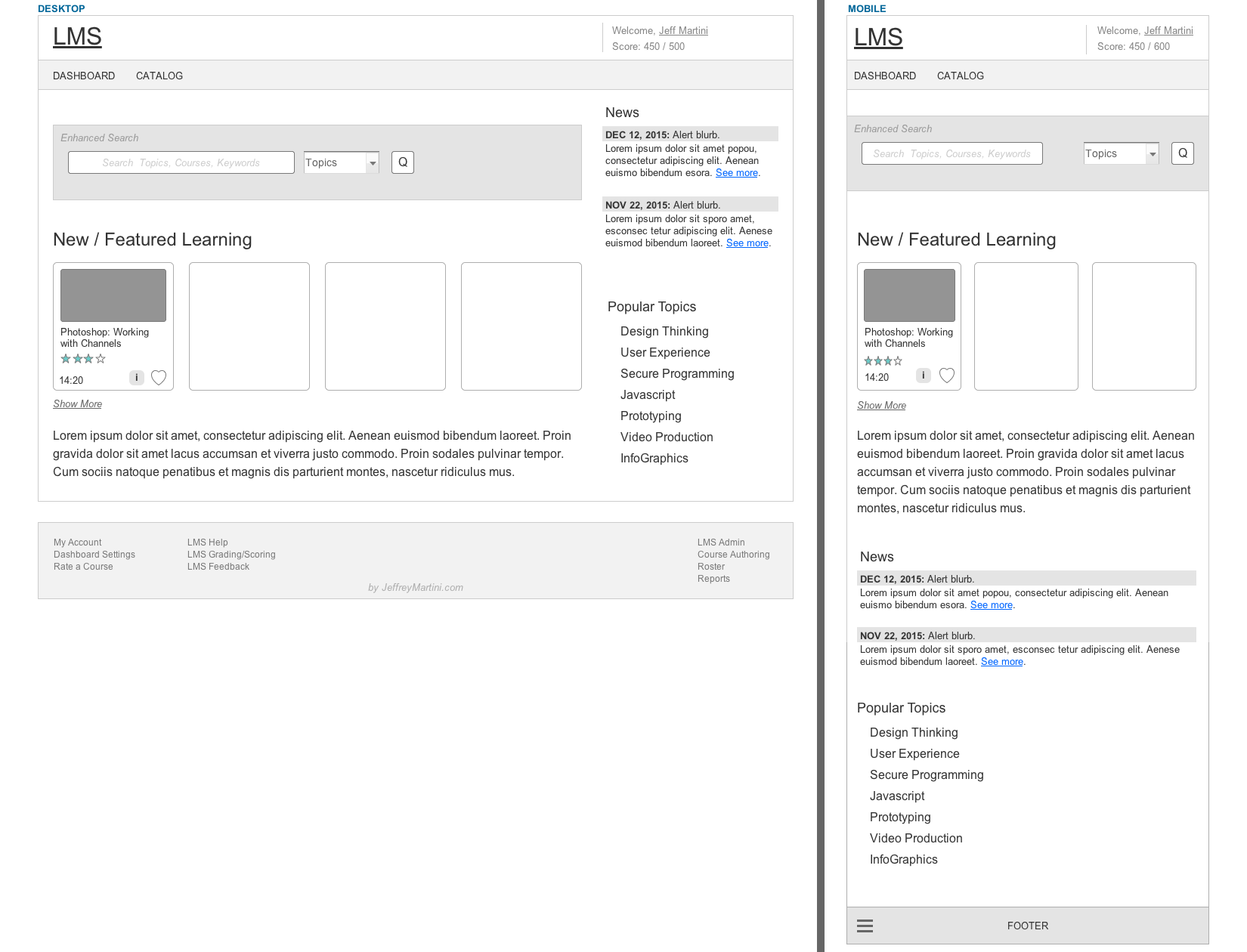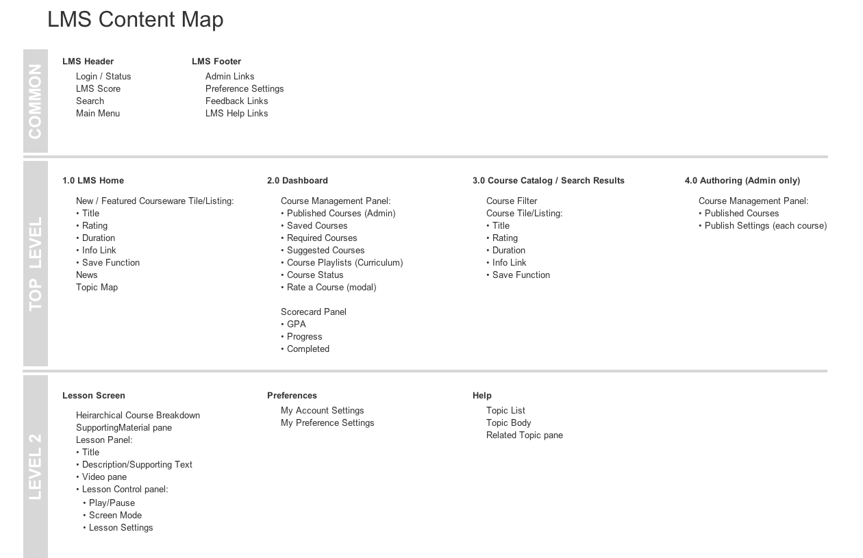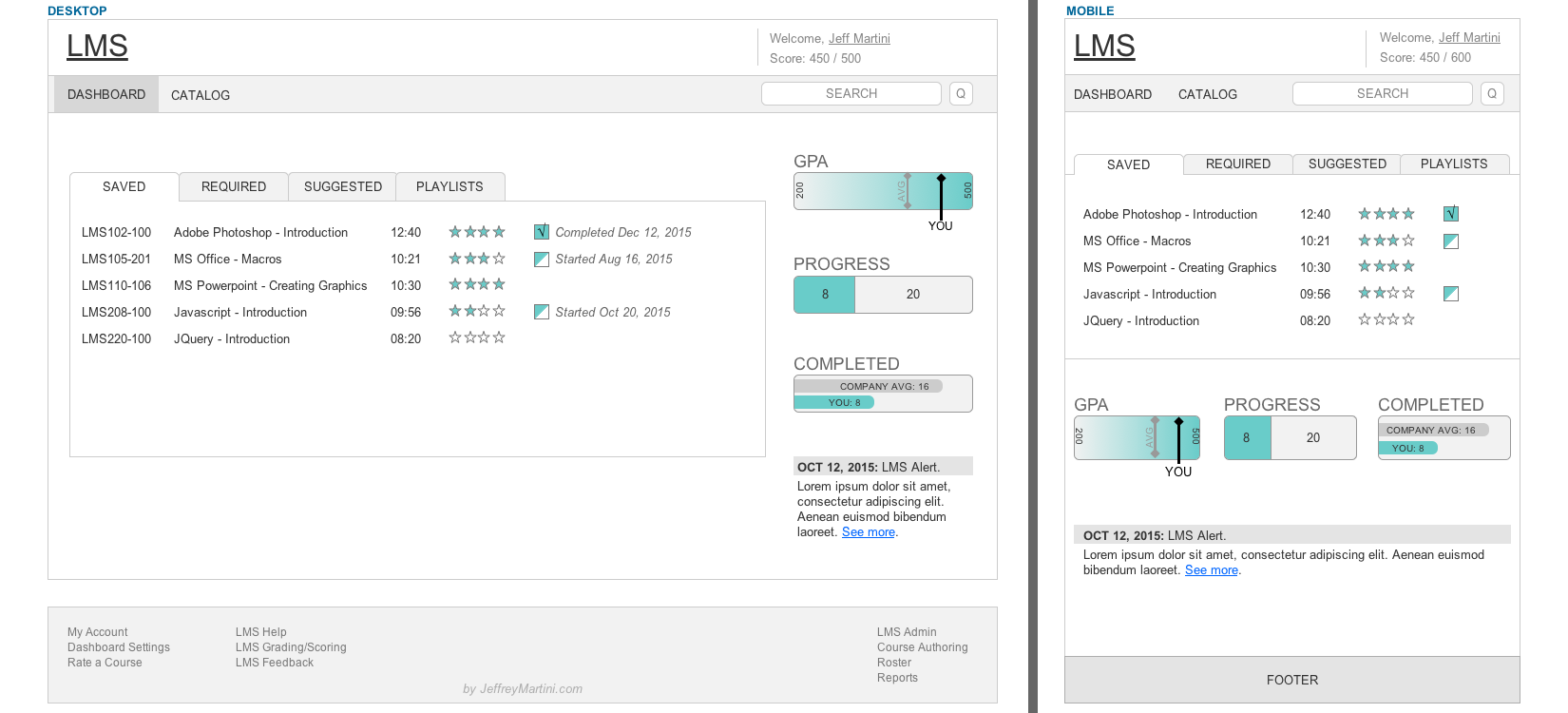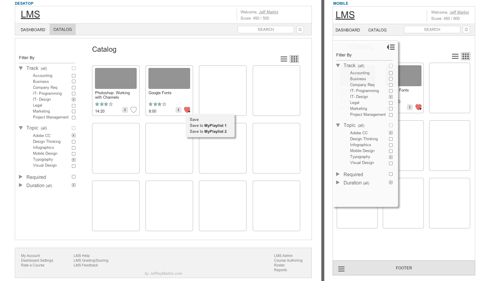 As a design exercise, I sought to design the interface for a sample Learning Management System. I drew on my previous research for The Boston Consulting Group and Harvard University to come up with likely business requirements and user goals, creating personas, IA, and then wireframes in Axure. The wireframes below show both desktop and mobile views.