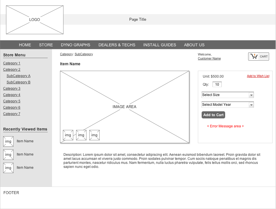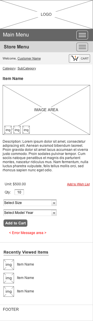 Updating an existing E-Commerce website and making it responsive. The medium-fidelity wireframes, created in Axure, show layout for both full-width and narrow mobile screens. Utilizing user & dealer feedback data, I have repositioned the different sections (Image, Description, and Transaction areas) for a more fluid user flow.