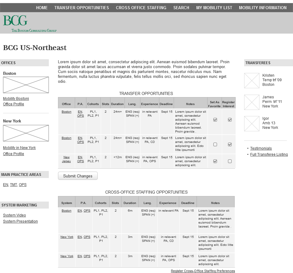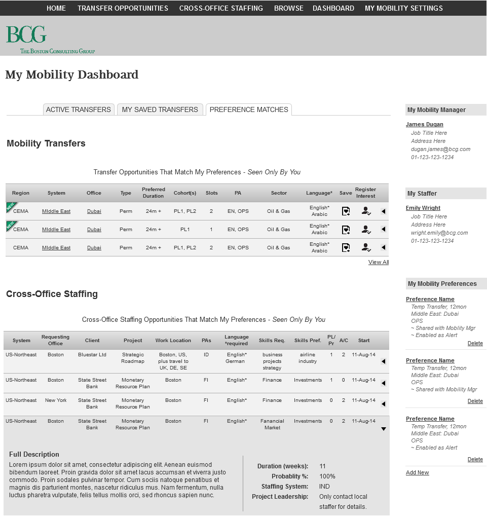 In contract with the Boston Consulting Group, I developed the UX and UI design for their internal web application to be used by their consultants, managers, and HR, to search, register interest, and track global opportunities. The challenge was to portray dense tabular data in an intuitive format that degraded elgantly on a minimum screen size of 768px (ipad in portrait mode). The solution was to first guide the user to one of several search paradigms (general browsing, geographic, filtered search, or within practice areas. The dense tabular data is then contextually rendered, based on a user's role, using a progressive disclosure model to keep visual clutter to a minimum. My involvement was to take user stories and process flows and formulate the IA, create reiterative wirframes (using Axure), create html mockups, then develop the overall visual design using CSS. This was project done in an agile development environment.